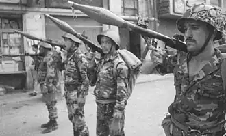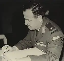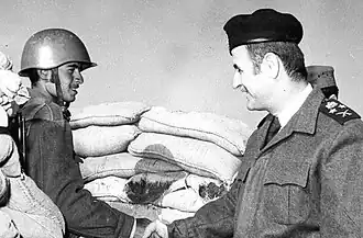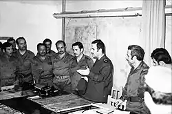 The coup was scheduled for 7 March, but postponed until the next day.[33] During the coup Assad led a small group to capture the Dumayr airbase, 40 kilometres (25 mi) northeast of Damascus.[34] His group was the only one that encountered resistance.[34] Some planes at the base were ordered to bomb the conspirators, and because of this Assad hurried to reach the base before dawn.[34] Because the 70th Armored Brigade's surrender took longer than anticipated, however, he arrived in broad daylight.[34] When Assad threatened the base commander with shelling, the commander negotiated a surrender;[34] Assad later claimed that the base could have withstood his forces.[34]