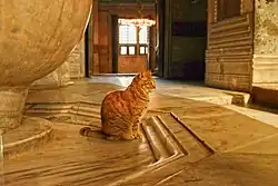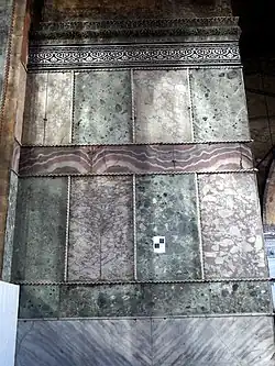 The basilica was built by architect Rufinus.[38][39] The church's main entrance, which may have had gilded doors, faced west, and there was an additional entrance to the east.[40] There was a central pulpit and likely an upper gallery, possibly employed as a matroneum (women's section).[40] The exterior was decorated with elaborate carvings of rich Theodosian-era designs, fragments of which have survived, while the floor just inside the portico was embellished with polychrome mosaics.[33] The surviving carved gable end from the centre of the western façade is decorated with a cross-roundel.[33] Fragments of a frieze of reliefs with 12 lambs representing the 12 apostles also remain; unlike Justinian's 6th-century church, the Theodosian Hagia Sophia had both colourful floor mosaics and external decorative sculpture.[33]
