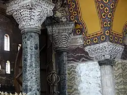 Basket capitals and verd antique and marble columns. The basket capitals of the building are carved with monograms of the names Justinian (Greek: ᾽Ιουστινιανός, romanized: Ioustinianós) and Thedora (Θεοδώρα, Theodṓra) and their imperial titles "βασιλεύς, basileús" and "αὐγούστα, augoústa".[57]