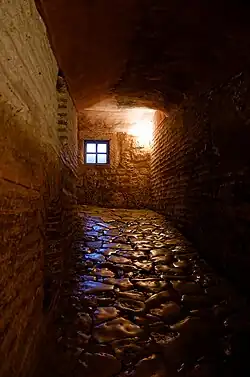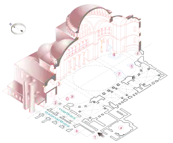 The building was accompanied by a baptistery and a skeuophylakion.[22] A hypogeum, perhaps with an martyrium above it, was discovered before 1946, and the remnants of a brick wall with traces of marble revetment were identified in 2004.[28] The hypogeum was a tomb which may have been part of the 4th-century church or may have been from the pre-Constantinian city of Byzantium.[28] The skeuophylakion is said by Palladius to have had a circular floor plan, and since some U-shaped basilicas in Rome were funerary churches with attached circular mausolea (the Mausoleum of Constantina and the Mausoleum of Helena), it is possible it originally had a funerary function, though by 405 its use had changed.[28] A later account credited a woman called Anna with donating the land on which the church was built in return for the right to be buried there.[28]