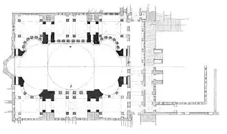 The church is known to have had a timber roof, curtains, columns, and an entrance that faced west.[22] It likely had a narthex and is described as being shaped like a Roman circus.[26] This may mean that it had a U-shaped plan like the basilicas of San Marcellino e Pietro and Sant'Agnese fuori le mura in Rome.[22] However, it may also have been a more conventional three-, four-, or five-aisled basilica, perhaps resembling the original Church of the Holy Sepulchre in Jerusalem or the Church of the Nativity in Bethlehem.[22] The building was likely preceded by an atrium, as in the later churches on the site.[27]