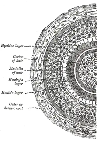 The root of the hair ends in an enlargement, the hair bulb, which is whiter in color and softer in texture than the shaft and is lodged in a follicular involution of the epidermis called the hair follicle. The bulb of hair consists of fibrous connective tissue, glassy membrane, external root sheath, internal root sheath composed of epithelium stratum (Henle's layer) and granular stratum (Huxley's layer), cuticle, cortex and medulla.[13]