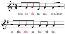 Hair makes many references to Shakespeare's plays and, at times, takes lyrical material directly from Shakespeare.[27] For example, the lyrics to the song "What a Piece of Work Is Man" are from Hamlet (II: scene 2), and portions of "Flesh Failures" ("the rest is silence") are from Hamlet's final lines. In "Flesh Failures/Let the Sun Shine In", the lyrics "Eyes, look your last!/ Arms, take your last embrace! And lips, O you/ The doors of breath, seal with a righteous kiss" are from Romeo and Juliet (V: iii).[103] According to Miller, the Romeo suicide imagery makes the point that, with our complicity in war, we are killing ourselves.[27] Claude's indecision, especially his resistance to burning his draft card, which ultimately causes his demise, parallels Hamlet, "the melancholy hippie".[104] This symbolism is carried into the last scene, where Claude appears as a ghostly spirit among his friends wearing an army uniform in an ironic echo of an earlier scene, where he says, "I know what I want to be ... invisible". Public Theater Artistic Director Oskar Eustis said: