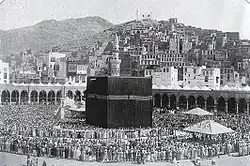 A 1907 photograph of people praying near the Kaaba in the Great Mosque of Mecca
