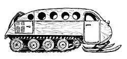 The concept originated with log hauling in the northeastern US, with the Lombard Steam Log Hauler built by Alvin Lombard of Waterville, Maine, from 1899 to 1917. The vehicle resembled a railway steam locomotive, with sled steering (or wheels) in front and chain-driven rear tracked rear crawlers driven by chains instead of the driving wheels of a locomotive.[1]