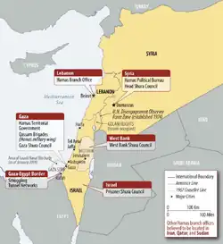Hamas has promoted Palestinian nationalism in an Islamic context[41] and initially sought a state in all of former Mandatory Palestine. It began acquiescing to 1967 borders in the agreements it signed with Fatah in 2005, 2006 and 2007.[42][43][44] In 2017, Hamas released a new charter[45] that supported a Palestinian state within the 1967 borders without recognizing Israel.[46][47][48] Hamas's repeated offers of a truce (for a period of 10–100 years[49]: 221–246 ) based on the 1967 borders are seen by many as consistent with a two-state solution,[50][51] while others state that Hamas retains the long-term objective of establishing one state in former Mandatory Palestine.[52]: 837, 839 While the 1988 Hamas charter was widely described as antisemitic,[53] Hamas's 2017 charter[54] removed the antisemitic language and declared Zionists, not Jews, the targets of their struggle.[55][56][57][58] It has been debated whether the charter has reflected an actual change in policy.[59][60] They are considered to be part of the Iranian-led "Axis of Resistance".[61]