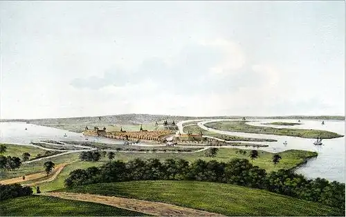 The name Hamburg comes from the first permanent building on the site, a castle which the Emperor Charlemagne ordered constructed in AD 808. It rose on rocky terrain in a marsh between the River Alster and the River Elbe as a defence against Slavic incursion, and acquired the name Hammaburg, burg meaning castle or fort. The origin of the Hamma term remains uncertain,[15] but its location is estimated to be at the site of today's Hammaburgplatz.[16][17]