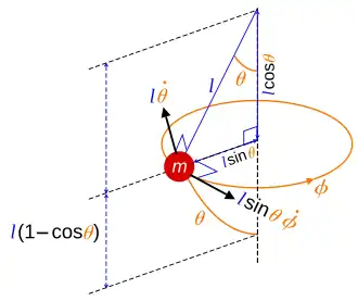 A spherical pendulum consists of a massm moving without friction on the surface of a sphere. The only forces acting on the mass are the reaction from the sphere and gravity. Spherical coordinates are used to describe the position of the mass in terms of (r, θ, φ), where r is fixed, r = ℓ.