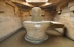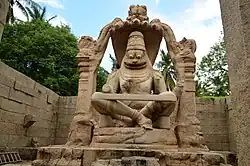 South of the Krishna temple's exterior are two adjacent shrines, one containing the largest monolithic Shiva Linga and the other with the largest monolithic Yoga-Narasimha avatar of Vishnu in Hampi.[74] The 3 metres (9.8 ft) Shiva Linga stands in water in a cubical chamber and has three eyes sketched on its top. South of this is the shrine for a 6.7 metres (22 ft)-high Narasimha—the man-lion avatar of Vishnu—seated in a yoga position. The Narasimha monolith originally had goddess Lakshmi with him, but it shows signs of extensive damage and a carbon-stained floor—evidence of attempts to burn the shrine down. The statue has been cleaned and parts of the shrine have been restored.[74]