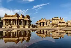 The hill has more than thirty small-to-moderate-sized temples, together with water cisterns, gateways, and secular pavilions.[90] The latest examples are dated to the early 14th century.[90][91] Some of the structures are differently-sized prototypes of temples or mandapas, assembled from blocks of stones. Others are completed monuments of different designs, such as the Phamsana style.[92] Two temple groups in this style look similar; each has a triple vimana consisting of square sanctums with each set connected to its own shared square mandapa.[91] The towers (shikaras) on these are pyramidal granite structures consisting of eleven stacked, shrinking squares and a top in the Deccan-style square kalasha finial.[91] Both sets are Shiva temples with triple linga; early sources misidentified these as Jain temples because of their simple exterior and interior walls.