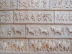 The Hazara Rama temple, referred to as the Ramachandra temple in inscriptions, occupied the western part of the urban core in the royal centre section of Hampi. This temple was dedicated to Rama of the Ramayana fame, and an avatar of Vishnu. It was the ceremonial temple for the royal family. The temple is dated to the early 15th century and is attributed to Devaraya I.[96] The temple's outer walls portray the Hindu Mahanavami (Dasara) and the spring Holi festival procession and celebrations in parallel bands of artwork.[96] The lowest band shows marching elephants, above it are horses led by horsemen, then soldiers celebrated by the public, then dancers and musicians, with a top layer depicting a procession of the general public. The depiction mirrors the description of festivals and processions in surviving memoirs of Persians and Portuguese who visited the Vijayanagara capital.[97][98]