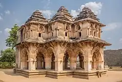 Most of the monuments are Hindu; the temples and the public infrastructure such as tanks and markets include reliefs and artwork depicting Hindu deities and themes from Hindu texts.[54] There are also six Jain temples and monuments and a Muslim mosque and tomb.[54] The architecture is built from the abundant local stone; the dominant style is Dravidian, with roots in the developments in Hindu arts and architecture in the second half of the 1st millennium in the Deccan region.[55] It also included elements of the arts that developed during the Hoysala Empire rule in the south between the 11th and 14th century such as in the pillars of Ramachandra temple and ceilings of some of the Virupaksha temple complex.[56][note 3] The architects also adopted an Indo-Islamic style in a few monuments, such as the Queen's bath and Elephant stables, which UNESCO says reflects a "highly evolved multi-religious and multi-ethnic society".[10][57]