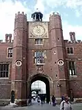 The gatehouse to the second, inner court was adorned in 1540 with the Hampton Court astronomical clock, an early example of a pre-Copernican astronomical clock. Still functioning, the clock shows the time of day, the phases of the moon, the month, the quarter of the year, the date, the sun and star sign, and high water at London Bridge.[23] This last item was of great importance to those visiting this Thames-side palace from London, as the preferred method of transport at the time was by barge, and at low water London Bridge created dangerous rapids. This gatehouse is also known today as Anne Boleyn's gate, after Henry's second wife. Work was still under way on Anne Boleyn's apartments above the gate when Boleyn was beheaded.[24]