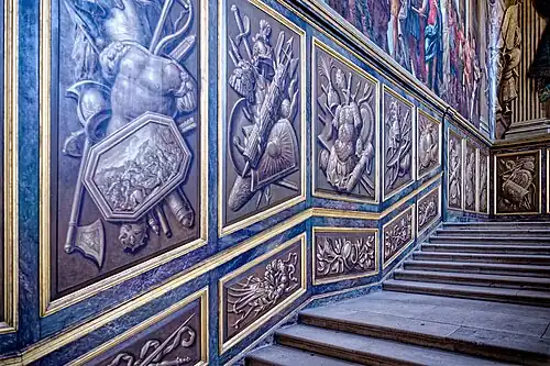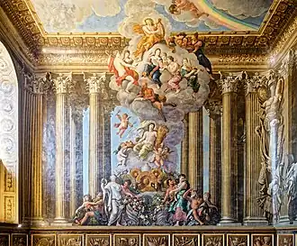 During this work, half the Tudor palace was replaced and Henry VIII's staterooms and private apartments were both lost; the new wings around the Fountain Court contained new state apartments and private rooms, one set for the King and one for the Queen. Each suite of state rooms was accessed by a state staircase. The royal suites were of completely equal value in order to reflect William and Mary's unique status as joint sovereigns.[36] The King's Apartments face south over the Privy Garden, the Queen's east over the Fountain Garden. The suites are linked by a gallery running the length of the east façade, another reference to Versailles, where the King and Queen's apartments are linked by the Hall of Mirrors. However, at Hampton Court, the linking gallery is of more modest proportions and decoration. The King's staircase was decorated with frescos by Antonio Verrio and delicate ironwork by Jean Tijou.[37] Other artists commissioned to decorate the rooms included Grinling Gibbons, Sir James Thornhill and Jacques Rousseau; furnishings were designed by Daniel Marot.[38]