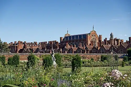 In the early 1690s, William III's massive rebuilding and expansion work, which was intended to rival the Palace of Versailles, destroyed much of the Tudor palace.[3] His work ceased in 1694, leaving the palace in two distinct contrasting architectural styles, domestic Tudor and Baroque. While the palace's styles are an accident of fate, a unity exists due to the use of pink bricks and a symmetrical, if vague, balancing of successive low wings.[4] George II was the last monarch to reside in the palace.