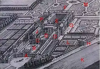 Christopher Wren's south front (G on plan), built for William III and Mary II, viewed from the Privy Garden