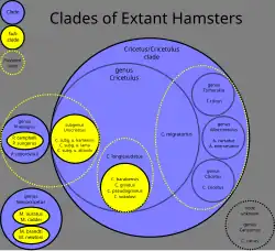 - ^ Lebedev, V. S.; Bannikova, A. A.; Neumann, K.; Ushakova, M. V.; Ivanova, N. V.; Surov, A. V. (26 February 2018). "Molecular phylogenetics and taxonomy of dwarf hamsters Cricetulus Milne-Edwards, 1867 (Cricetidae, Rodentia): description of a new genus and reinstatement of another". Zootaxa. 4387 (2): 331–349. Bibcode:2018Zoot.43877.2.5L. doi:10.11646/zootaxa.4387.2.5. PMID 29689907. Retrieved 9 December 2024.