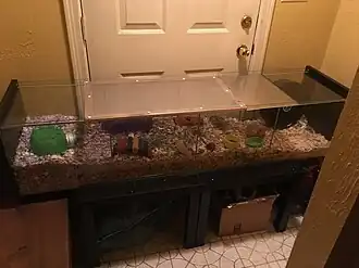 Hamsters have poor eyesight; they are nearsighted and colorblind.[14][15] Their eyesight leads to them not having a good sense of distance or knowing where they are, but that does not stop them from climbing in (and sometimes out of) their cages or from being adventurous. Hamsters can sense movement around at all times, which helps protect them from harm in the wild. In a household, this sense helps them know when their owner is near.[16] Hamsters have scent glands on their flanks (and abdomens in Chinese and dwarf hamsters) which they rub against the surface beneath them, leaving a scent trail.[17] Hamsters also use their sense of smell to distinguish between the sexes and to locate food. Mother hamsters can also use their sense of smell to find their own babies and identify which ones are not theirs. Their scent glands can also be used to mark their territories, their babies, or their mate.[18] Hamsters catch sounds by having their ears upright. They tend to learn similar noises and begin to know the sound of their food and even their owner's voice.[16] They are also particularly sensitive to high-pitched noises and can hear and communicate in the ultrasonic range.[8]