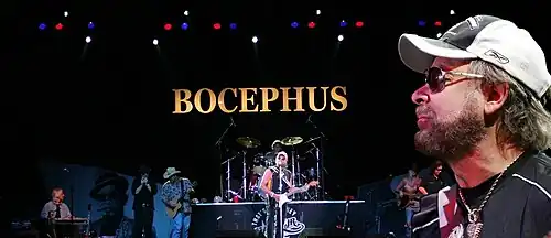 As a multi-instrumentalist, Williams' repertoire of skills includes guitar, bass guitar, upright bass, steel guitar, banjo, Resonator guitar, piano, keyboards, saxophone, harmonica, fiddle, and drums.[6] Williams began his recording career performing covers of his father's songs. Despite catering to the country music market, Williams preferred to listen to rhythm and blues.[16] Williams also recorded singles under the name Luke the Drifter Jr.[17] (a reference to his father's alias "Luke the Drifter"), rock and roll singles under the aliases Rockin' Randall[18] and Bocephus[17] (a nickname given to him by his father), and blues under the name Thunderhead Hawkins.[16] Williams' music has been categorized as country rock,[5] blues rock,[19] southern rock,[20] outlaw country,[21] rockabilly[19] and rock and roll.[19]
