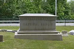 On July 4, 1891, Hamlin collapsed and fell unconscious while playing cards at the Tarratine Club he founded in downtown Bangor, and died there a few hours later, at the age of 81.[24] He was buried in the Hamlin family plot at Mount Hope Cemetery in Bangor. He outlived six of his successors in the vice presidency (Andrew Johnson, Schuyler Colfax, Henry Wilson, William A. Wheeler, Chester A. Arthur, and Thomas A. Hendricks), more than any other U.S. vice president. He was also the third American Vice President to die on Independence Day.