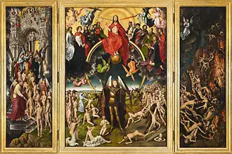 He painted for the Hospitallers in 1479 and 1480. In 1477, when he was believed dead, he was under contract to create an altarpiece for the gild-chapel of the booksellers of Bruges.[3] This altarpiece, Scenes of the Passion of Christ, is now in the Galleria Sabauda of Turin. The Last Judgment, which had been in Gdańsk since 1473 is now in the National Museum there. The Last Judgment was commissioned by Angelo Tani, erstwhile director of the Bruges branch of the Medici Bank, for a chapel at what is now the Badia Fiesolana in Fiesole. When the triptych is closed Tani and his wife are shown kneeling in prayer. It was shipped to Fiesole on a vessel that was captured by Danzig privateer Paul Beneke in April 1473.