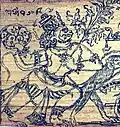 During this era, Hanuman evolved and emerged as the ideal combination of shakti and bhakti.[13] Stories and folk traditions in and after the 17th century, began to reformulate and present Hanuman as a divine being, as a descendant of deities, and as an avatar of Shiva.[36] He emerged as a champion of those religiously persecuted, expressing resistance, a yogi,[37] an inspiration for martial artists and warriors,[38] a character with less fur and increasingly human, symbolizing cherished virtues and internal values, and worthy of devotion in his own right.[10][39] This evolution of Hanuman's religious status, and his cultural role as well as his iconography, continued through the colonial era and into post-colonial times.[40]