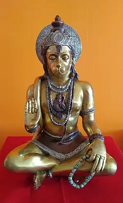 In the medieval Hinduism Bhakti movement, figures such as Samarth Ramdas, have portrayed Hanuman as an emblem of nationalism and defiance against oppression.[10] According to Vaishnava tradition, the sage Madhvacharya posited that Vayu aids Vishnu in his earthly incarnations, a role akin to Hanuman's assistance to Rama.[11] In recent times, the veneration of Hanuman through iconography and temple worship has significantly increased.[12] He epitomizes the fusion of "strength, heroic initiative, and assertive excellence" with "loving, emotional devotion" to his lord Rama, embodying both Shakti and Bhakti.[13] Subsequent literature has occasionally depicted him as the patron deity of martial arts, meditation, and scholarly pursuits.[14] He is revered as an exemplar of self-control, faith, and commitment to a cause, transcending his outward Vanara appearance.[12][15][16] Traditionally, Hanuman is celebrated as a lifelong celibate, embodying the virtues of chastity.[12][17] Hanuman's abilities are partly attributed to his lineage from Vayu, symbolizing a connection with both the physical and the cosmic elements.[18]