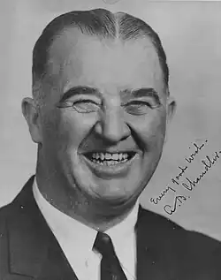 At the expiration of his partial term in 1942, Chandler faced a challenge from former ally John Y. Brown Sr. in the Democratic primary.[59] As a result of his votes on the anti-lynching bill and the poll tax repeal, the Louisville chapter of the National Association for the Advancement of Colored People worked against his re-election effort.[40] During the campaign, Brown accused Chandler of abusing his power, including of having a swimming pool installed at his home, in violation of the federal rationing provisions that had been implemented during World War II.[59] Chandler invited the Truman Committee to investigate the installation of the pool and no violations of the federal rationing provisions were found.[60] Chandler went on to defeat Brown and was easily re-elected in the general election over Republican Richard J. Colbert.[57]