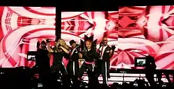 To further promote the album, Madonna embarked on the Sticky & Sweet Tour, her eighth worldwide concert tour. It began in August 2008 and was Madonna's first tour from her new recording and business deal with Live Nation. The tour was announced in May 2008, with dates for American and British venues revealed.[41] Though initially planned, the tour failed to visit Australia due to financial problems and the financial recession.[42] Costume designer Arianne Phillips designed the costumes, supported by a number of famous designers and brands, namely Givenchy, Stella McCartney, Yves Saint Laurent, Roberto Cavalli, and Jeremy Scott.[43] The stage for the main show was planned similarly to that of her 2006 Confessions Tour. After the Sticky & Sweet Tour concluded in 2008, Madonna announced plans to begin a second European leg in 2009 to perform in cities she had either never been to, or had not played for a long time.[44]