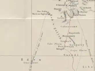 Close-up of an 1885 Royal Geographical Society map, showing Hargeisa (Harrer-es-Sagheer) as well as the Eidagale subtribe (Eed-a-galleh) residing within and around the town. The Naasa Hablood hills (Nas Hubla) can also be seen in the map
