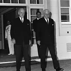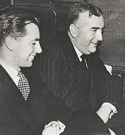 Holt was twenty-seven years old when he entered parliament, making him its youngest member. He kept a relatively low profile in his first few years, but spoke on a wide range of topics.[13] When Robert Menzies became prime minister in April 1939, he made Holt one of four ministers without portfolio. His inclusion was made possible by the collapse of the coalition with the Country Party – previously a certain number of positions had been reserved for Country MPs, but the new ministry was composed solely of UAP members.[14] Although Holt officially had no portfolio, he effectively was an assistant minister to Richard Casey, who headed the Department of Supply & Development. He was given responsibility for the Council for Scientific and Industrial Research (CSIR),[15] and also acted for periods as Minister for Trade and Customs and Minister for Civil Aviation and Air while the incumbents were overseas.[16] Holt's first stint as a government minister came to an end in March 1940, when the coalition with the Country Party was reinstituted. His replacement was Arthur Fadden, another future prime minister.[17]