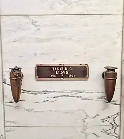 Lloyd died of prostate cancer on March 8, 1971, at the age of 77 in his Greenacres home in Beverly Hills, California.[30][76][77] He was interred in a crypt in the Great Mausoleum at Forest Lawn Memorial Park Cemetery in Glendale, California.[78] His former co-star Bebe Daniels died eight days after him,[79] and his son Harold Lloyd Jr. died three months after him.[80][81]
