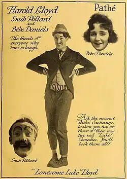 Lloyd soon became friendly with aspiring filmmaker Hal Roach.[17] Lloyd began collaborating with Roach, who had formed his own studio in 1913. Roach and Lloyd created "Lonesome Luke", a comic character inspired by the success of Charlie Chaplin.[18] Luke was a comic grotesque with loud clothes and a false moustache, similar to many early screen comics, but the young Lloyd gave the character great energy and enthusiasm. His antics won a popular following, and his one-reel, 10-minute comedies were soon expanded to two-reel, 20-minute comedies. Hal Roach hired Bebe Daniels to support Lloyd in 1914; Lloyd and Daniels became involved romantically and were known as "The Boy" and "The Girl".