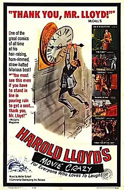 Following his death, and after extensive negotiations, most of his feature films were leased to Time-Life Films in 1974.[46] As Tom Dardis confirms: "Time-Life prepared horrendously edited musical-sound-track versions of the silent films, which are intended to be shown on TV at sound speed [24 frames per second], and which represent everything that Harold feared would happen to his best films".[46] Time-Life released the films as half-hour television shows, with two clips per show. These were often near-complete versions of the early two-reelers, but also included extended sequences from features such as Safety Last! (terminating at the clock sequence) and Feet First (presented silent, but with Walter Scharf's score from Lloyd's own 1960s re-release). Time-Life released several of the feature films more or less intact, also using some of Scharf's scores which had been commissioned by Lloyd. The Time-Life clips series included a narrator rather than intertitles. Various narrators were used internationally: the English-language series was narrated by Henry Corden.[47]