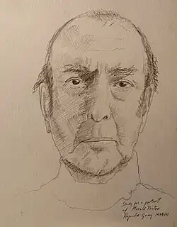 Pinter enjoyed running and broke the Hackney Downs School sprinting record.[18][19] He was a cricket enthusiast, taking his bat with him when evacuated during the Blitz.[20] In 1971, he told Mel Gussow: "one of my main obsessions in life is the game of cricket—I play and watch and read about it all the time."[21] He was chairman of the Gaieties Cricket Club, a supporter of Yorkshire Cricket Club,[22] and devoted a section of his official website to the sport.[23] One wall of his study was dominated by a portrait of himself as a young man playing cricket, which was described by Sarah Lyall, writing in The New York Times: "The painted Mr. Pinter, poised to swing his bat, has a wicked glint in his eye; testosterone all but flies off the canvas."[24][25] Pinter approved of the "urban and exacting idea of cricket as a bold theatre of aggression."[26] After his death, several of his school contemporaries recalled his achievements in sports, especially cricket and running.[27] The BBC Radio 4 memorial tribute included an essay on Pinter and cricket.[28]