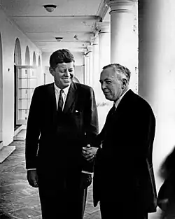 Wilson's course in intra-party matters in the 1950s and early 1960s left him neither fully accepted nor trusted by the left or the right in the Labour Party. Despite his earlier association with Bevan, in 1955 he backed Hugh Gaitskell, the right-wing candidate in internal Labour Party terms, against Bevan for the party leadership election.[26] Gaitskell appointed him Shadow Chancellor of the Exchequer in 1955, and he proved to be very effective.[27] One of his procedural moves caused a substantial delay to the progress of the Government's Finance Bill in 1955, and his speeches as Shadow Chancellor from 1956 were widely praised for their clarity and wit. He coined the term "Gnomes of Zurich" to ridicule Swiss bankers for selling Britain short and pushing the pound sterling down by speculation.[28] He conducted an inquiry into the Labour Party's organisation following its defeat in the 1955 general election; its report compared Labour's organisation to an antiquated penny-farthing bicycle, and made various recommendations for improvements.[29] Unusually, Wilson combined the job of Chairman of the House of Commons' Public Accounts Committee with that of Shadow Chancellor from 1959, holding that position until 1963.