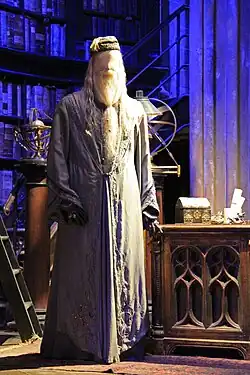 For Remus Lupin, Temime opted for "tweeds typical of England." Cuarón stated that the character should look like "an uncle who parties hard on the weekends", so Temime preserved his gown "unkempt and more shabby than the other teachers' robes."[57] For Trelawney, Thompson made sketches of the costumes and sent them to Temime and Cuarón. Thompson saw the character as "a person who hasn't looked in the mirror for a long time". In order to highlight the character's short-sightedness, Temime used material filled with mirrors and eyes, as well as oversized glasses with magnifying lenses.[57] Cuarón wanted Dumbledore to look like "an old hippie, but still very chic and with a lot of class". Temime used tie-dyed silk that would float behind him while walking, which she considered "a much lighter look" that gave the character more energy, in contrast with the "heavy and majestic" costumes designed for Harris' portrayal of Dumbledore.[57]