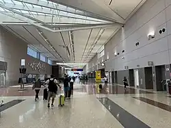 The airport has a total of 110 gates across two passenger terminals, which are numbered 1 and 3, and a satellite concourse called Concourse D. Terminal 1 contains three concourses labeled A, B, and C. Terminal 3 houses the E gates and handles international arrivals.[79] Terminal 3 and Concourse D are able to receive international flights, and a tunnel links the international gates in Concourse D to the customs checkpoint.[66] Of these international gates, Concourse D has a 3-jetway stand (D21/22) that can accommodate an Airbus A380.[80] There is an airside tram system with three lines. The green and blue lines connect the central part of Terminal 1 with Concourses C and D, respectively. The red line runs between Terminal 3 and Concourse D.[81]