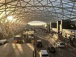 The upper level of the Domestic Terminal South pickup and drop-off area. All ticket counters and baggage facilities on this side of the airport's domestic terminal are operated by Delta Air Lines.