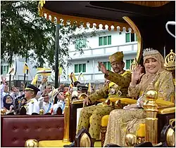 The culmination of all the activities was a glamorous banquet held at the Istana Nurul Iman, where the Yang di-Pertuan Agong Azlan Shah and Raja Permaisuri Tuanku Bainun of Malaysia, Prince Edward, and the Sultans and Consorts of the Malaysian states were among the royal attendees.[58] The sultan made an appearance before his people during a ceremony at the Istana Nurul Iman, accompanied by his two wives and ten children, all of whom were dressed in yellow attire and dazzling in jewels. "My late father's policies, particularly in safeguarding peace, increasing the standard of living of the people and the prosperity of the country, as well as upholding... Islam," the 46-year-old sultan pledged in a brief address. After that, the sultan traveled to the capital in a Rolls-Royce Silver Spur limousine and rode a massive chariot made of wood and gold that had servants dressed in black costume.[58]