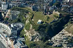 The sandstone cliffs have been the subject of considerable erosion in relatively recent times: much of the Castle was lost to the sea before the present sea defences and promenade were built, and a number of cliff-top houses are in danger of disappearing around the nearby village of Fairlight.