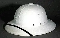 | Pith helmet | A lightweight, rigid, cloth-covered helmet made of cork or pith, with brims front and back. Worn by Europeans in tropical colonies in the 1800s. | |