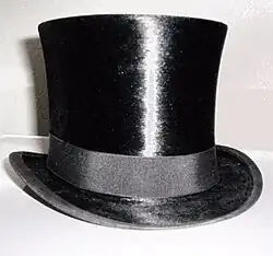 Top hat | Also known as a beaver hat, a magician's hat, or, in the case of the tallest examples, a stovepipe hat. A tall, flat-crowned, cylindrical hat worn by men in the 19th and early 20th centuries, now worn only with morning dress or evening dress. Cartoon characters Uncle Sam and Mr. Monopoly are often depicted wearing such hats. Once made from felted beaver fur. |