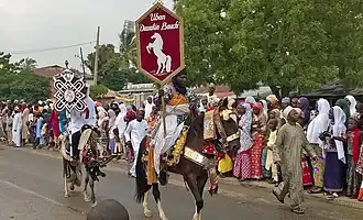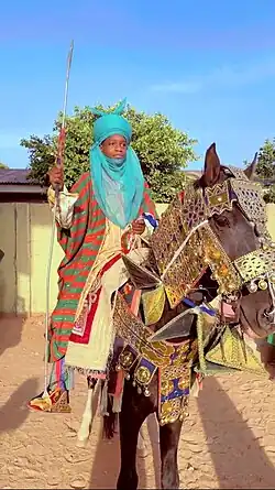 Predominantly Hausa-speaking communities are scattered throughout West Africa and on the traditional Hajj route north and east traversing the Sahara, with an especially large population in and around the town of Agadez.[19] Other Hausa have also moved to large neighbouring coastal cities in the region such as Lagos, Port Harcourt, Accra, Abidjan and Cotonou as well as to parts of North Africa such as Libya over the course of the last 500 years. The Hausa are traditionally agriculturists who live in small villages as well as in precolonial towns and cities. The Hausa aristocracy had historically developed an equestrian based culture.[20] Still a status symbol of the traditional nobility in Hausa society, the horse still features in the Eid day celebrations, known as Ranar Sallah (in English: the Day of the Prayer).[21] Daura is the cultural center of the Hausa people. The town predates all the other major Hausa towns in tradition and culture.[22]