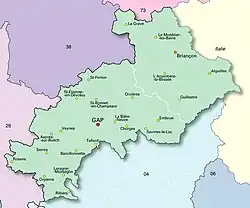 Hautes-Alpes (French pronunciation: [ot.z‿alp] ⓘ; Occitan: Auts Aups; English: Upper Alps) is a department in the Provence-Alpes-Côte d'Azur region of Southeastern France. It is located in the heart of the French Alps, after which it is named. Hautes-Alpes had a population of 141,220 as of 2019,[3] which makes it the third least populated French department. Its prefecture is Gap; its sole subprefecture is Briançon. Its INSEE and postal code is 05.