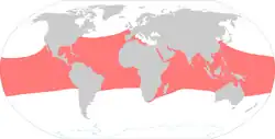 In the Indian Ocean, hawksbills are a common sight along the east coast of Africa. One can find them in the seas surrounding Madagascar and Mozambique, and island groups such as Primeiras e Segundas, which include the turtle protection island of Ilha do Fogo.[25] Hawksbills are also common along the southern Asian coast, including the Persian Gulf, the Red Sea, and the Indian subcontinental and Southeast Asian coasts. They are present across the Malay Archipelago and northern Australia. Their Pacific range is limited to the ocean's tropical and subtropical regions. In the west, it extends from the southwestern tips of the Korean Peninsula and the Japanese Archipelago south to northern New Zealand.