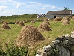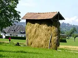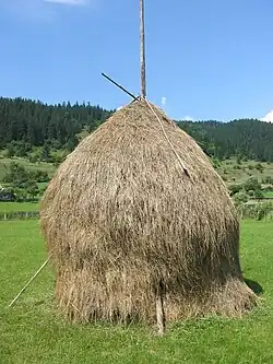 Loose stacks are built to prevent the accumulation of moisture and promote drying or curing. In some places, this is accomplished by constructing stacks with a conical or ridged top.[33][37] The exterior may look gray on the surface after weathering, but the inner hay retains traces of its fresh-cut aroma and maintains a faded green tint.[33] They can be covered with thatch,[37][38] or kept within a protective structure. One such structure is a moveable roof supported by four posts, historically called a Dutch roof, hay barrack, or hay cap.[38][39] Haystacks may also be built on top of a foundation laid on the ground to reduce spoilage, in some places made of wood or brush.[33] In other areas, hay is stacked loose, built around a central pole, a tree, or within an area of three or four poles to add stability to the stack.[40][41][42]