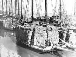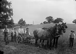 With the invention of agricultural machinery such as the tractor and the baler, most hay production became mechanized by the 1930s. Hay baling began with the invention of the first hay press in about 1850.[15] Timothy grass and clover were the most common plants used for hay in the early 20th century in the United States, though both plants are native to Europe.[4] Hay was baled for easier handling and to reduce space required for storage and shipment. The first bales weighed about 300 pounds. The original machines were of a vertical design similar to the one photographed by the Greene Co. Historical Society. They used a horse-driven screw-press mechanism or a dropped weight to compress the hay. The first patent went to HL Emery for a horse-powered, screw-operated hay press in 1853. Other models were reported as early as 1843 built by PK Dederick's Sons of Albany, New York, or Samuel Hewitt of Switzerland County, Indiana.[16] Later, horizontal machines were devised. One was the “Perpetual Press” made by PK Dederick of Albany in 1872. They could be powered by steam engines by about 1882. The continuous hay baler arrived in 1914.