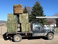 Small square bales are made in two main variations. The smaller "two-tie" (two twines to hold the bale together) or larger "three-tie" (three twines to hold the bale together). They vary in size within both groups but are generally popular in different markets. The smaller two-tie bales are favored in the hobby animal market and are preferred for their convenient size. The larger, three-tie bales are favored by producers wanting to export bales because of the increase of efficiency in transportation and also by customers for a better price per ton. The two-tie small bales are the original form factor of hay bales. Balers for both types of small bales are still manufactured, as well as stackers,[25] bundlers[26] and bale accumulators[27] for handling them. Some farms still use equipment manufactured over 50 years ago to produce small bales. The small bale remains part of overall ranch lore and tradition with "hay bucking" competitions still held for fun at many rodeos and county fairs. Small square bales are often stacked mechanically or by hand in a crisscrossed fashion sometimes called a "haystack", "rick" or "hayrick". Rain tends to wash nutrition out of hay and can cause spoilage or mold; hay in small square bales is particularly susceptible. Small bales are, therefore, often stored in a haymow or hayshed. Haystacks built outside are usually protected by tarpaulins. If this is not done, the top two layers of the stack are often lost to rot and mold, and if the stack is not arranged in a proper haystack, moisture can seep even deeper into the stack. The rounded shape and tighter compaction of round bales make them less susceptible to spoilage, as the water is less likely to penetrate the bale. Adding net wrap, which is not used on square bales, offers even more weather resistance. People who keep small numbers of animals may prefer small bales that one person can handle without machinery. There is also a risk that hay bales may be moldy or contain decaying carcasses of tiny creatures accidentally killed by baling equipment and swept up into the bale, producing toxins such as botulinum toxin. Both can be deadly to non-ruminant herbivores such as horses, and when this occurs, the entire contaminated bale generally is thrown out, another reason some people continue to support the market for small bales.