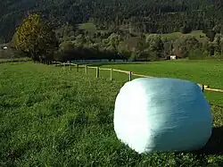 For animals that eat silage, a bale wrapper may be used to seal a round bale completely and trigger the fermentation process. It is a technique used as a money-saving process by producers who do not have access to a superior silo, and for producing silage that is transported to other locations.[29] In very damp climates, it is a legitimate alternative to drying hay completely. When processed properly, the natural fermentation process prevents mold and rot. Round bale silage is also sometimes called "haylage", and is seen more commonly in Europe than in either the United States or Australia. Hay stored in this fashion must remain completely sealed in plastic, as any holes or tears will allow the entrance of oxygen and can stop the preservation properties of fermentation and lead to spoilage.[30]